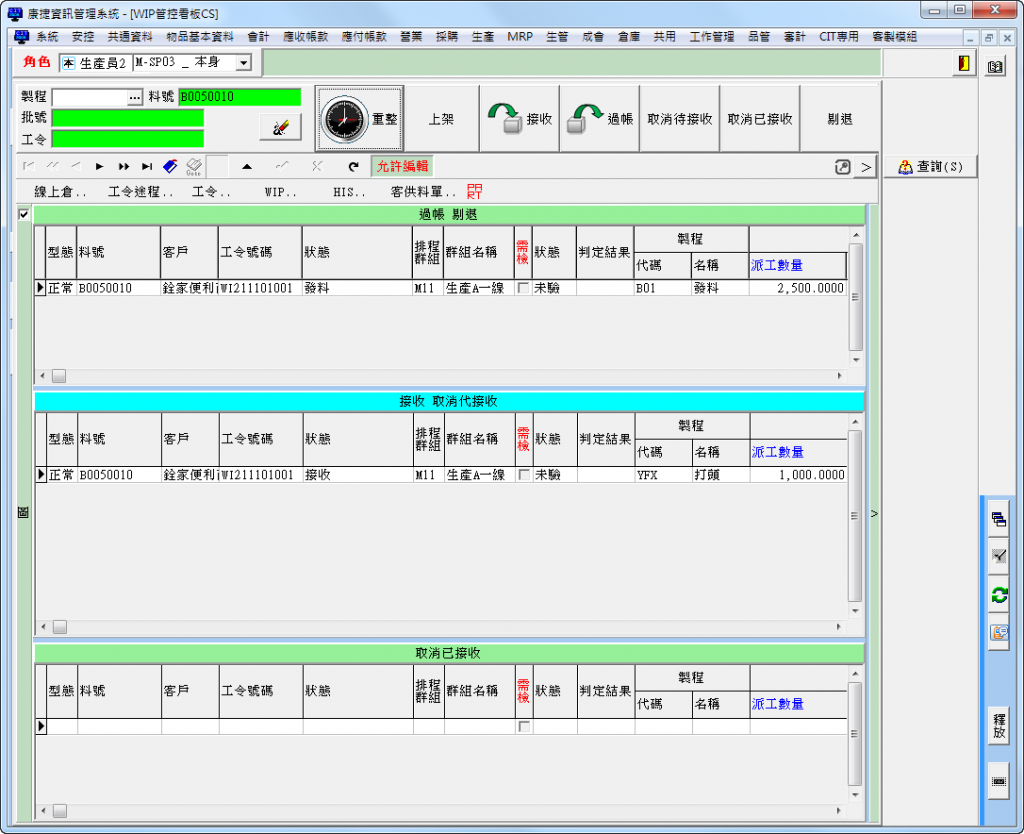 由於我們剛剛於這個料號的途程,設定為自動過帳,所以這邊接收之後,就自動會生產入庫了,當然如果貴公司有多個站點要加工,就可以設定各個站點過帳。