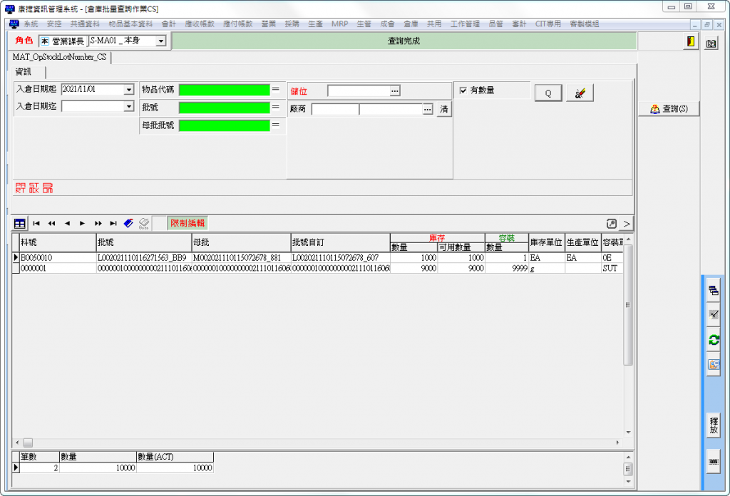 - 使用倉庫批量查詢作業CS,可以看到已完成入庫的批量1000。