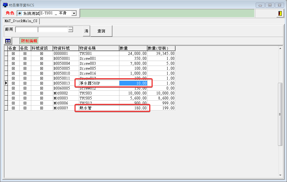 生產入庫之後,可以查看物品庫存資料,這邊可以看到B0050013淨水器580P增加了10個,然後熱水管從200變成180,耗用掉了20個。