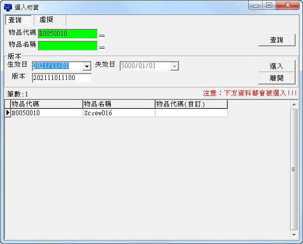 在物品代碼輸入B0050013,按下查詢,可以查詢到我們剛剛建立的淨水器580P,這邊我們要設定這個BOM的版本週期,所以在生效日點選今天,會自動帶出版本編號,當然還可以自行修改。