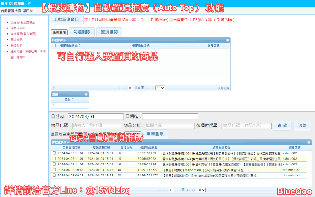 蝦皮 自動置頂快速上手,簡單四步驟 Posted on 2024-04-25Updated on 2025-04-10by 康捷QooCategories:自動置頂, 蝦皮API, 蝦皮對帳王 蝦皮 自動置頂快速上手,簡單四步驟