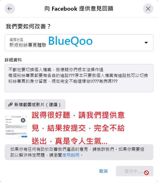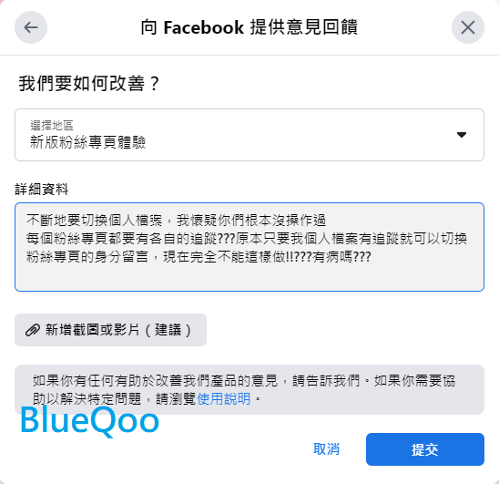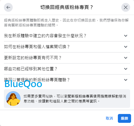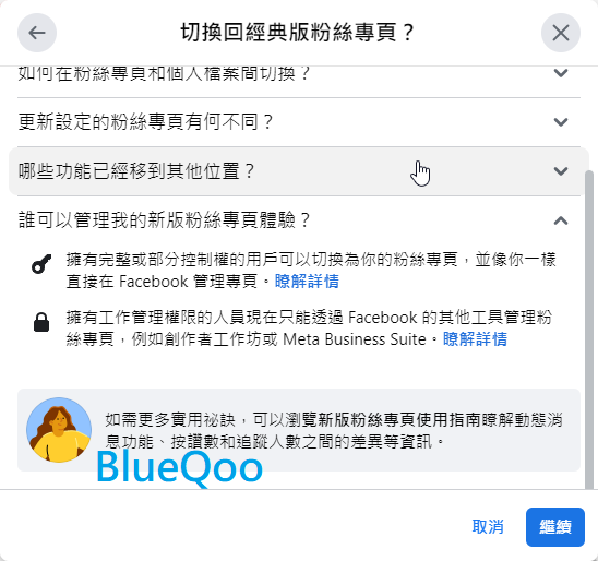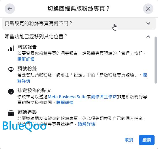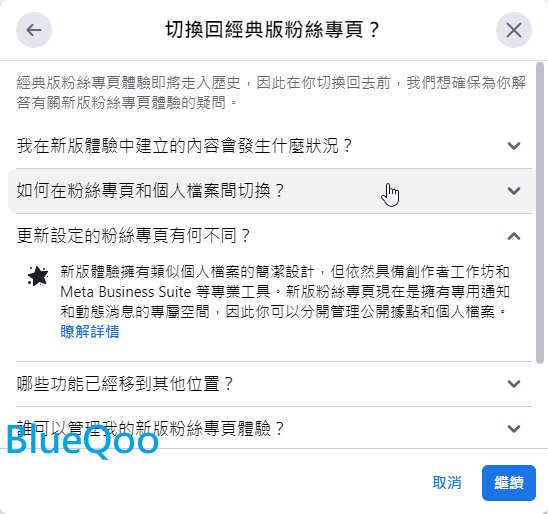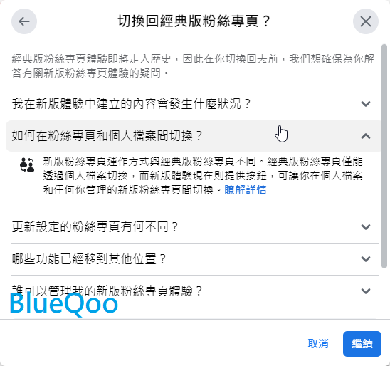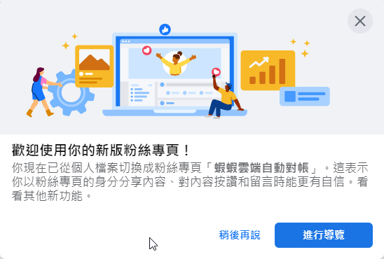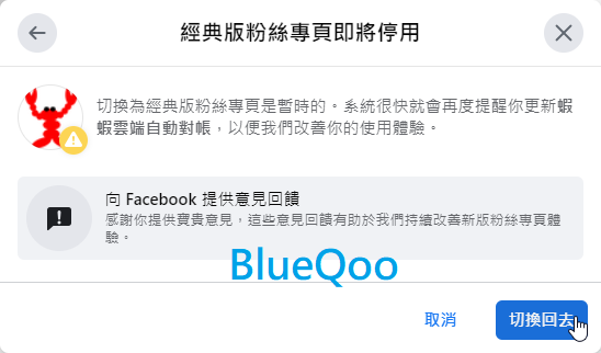 然後描述一下你的臉書被強迫改為新版粉專,卻找不到切換回來的選項,