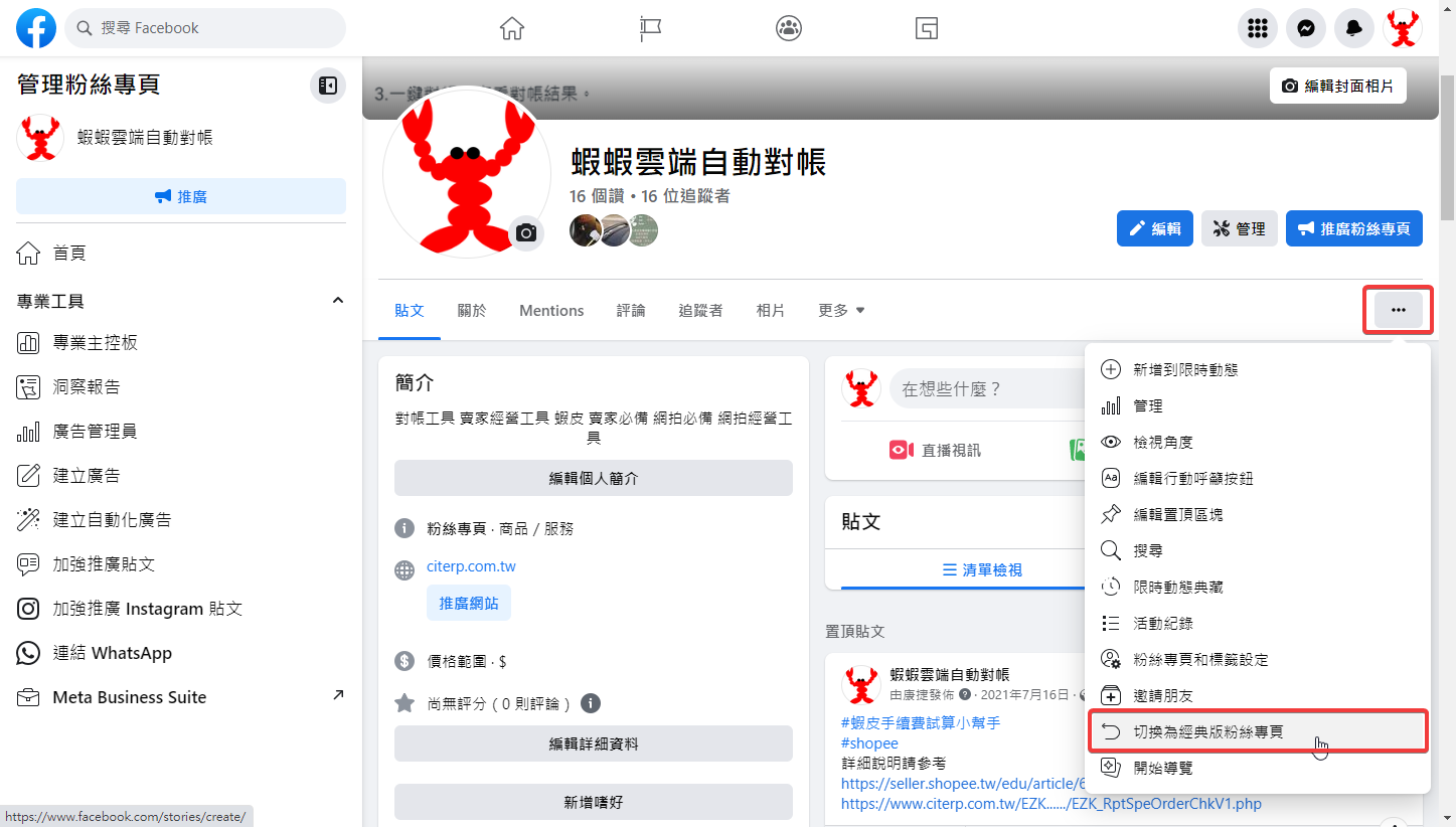 6.新版根本難用到爆,馬上改回經典版粉絲專頁,按下首頁的…,接著按下切換為經典版粉絲專頁即可。