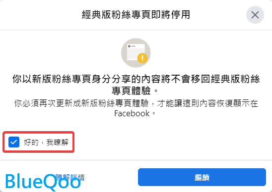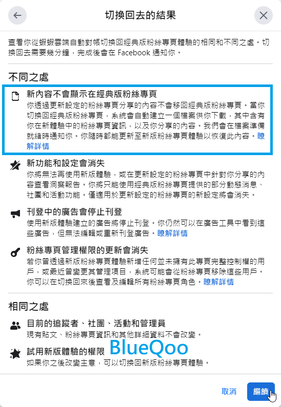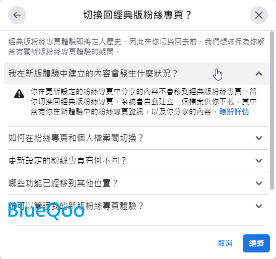 14.這邊還會再提示,在新版發佈的內容,不會在經典版粉絲專頁顯示,其實我覺得這是臉書故意這樣設計的,就是讓你更難回經典版粉專。