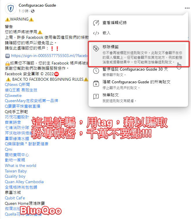 第二步,於畫面中找到被標記的那一篇文章,按下文章的…,然後點下移除標籤即可。