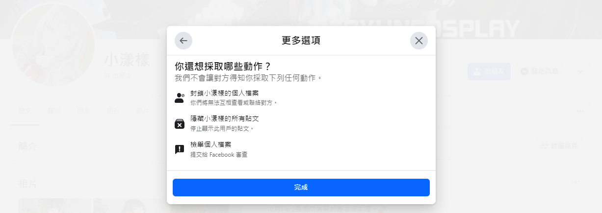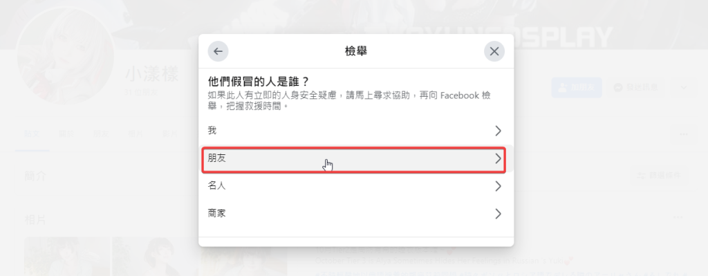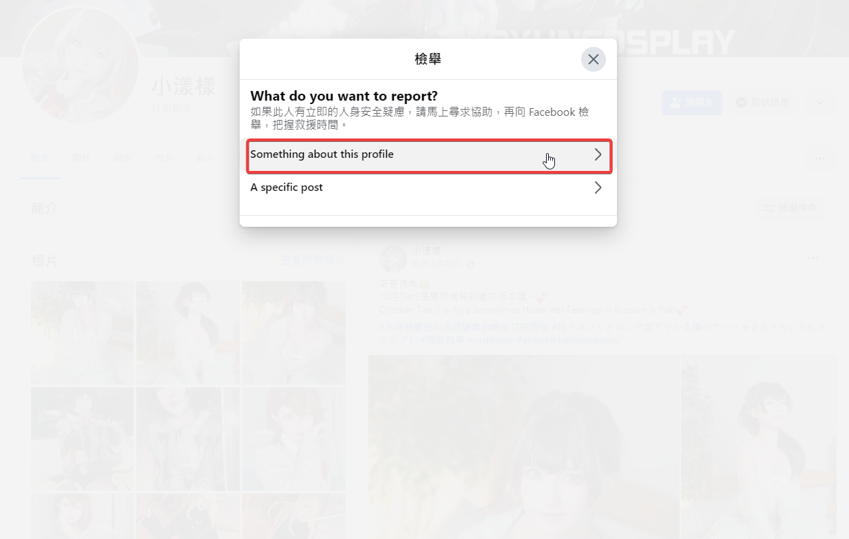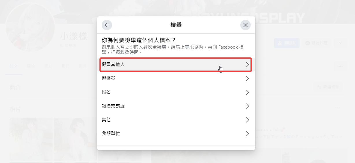先進入到假帳號的個人臉書,右邊的…按鈕按下去,選擇檢舉個人檔案