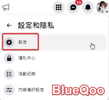第一步:先到自己的粉專,然後點右上角的大頭像,接著選擇設定和隱私。