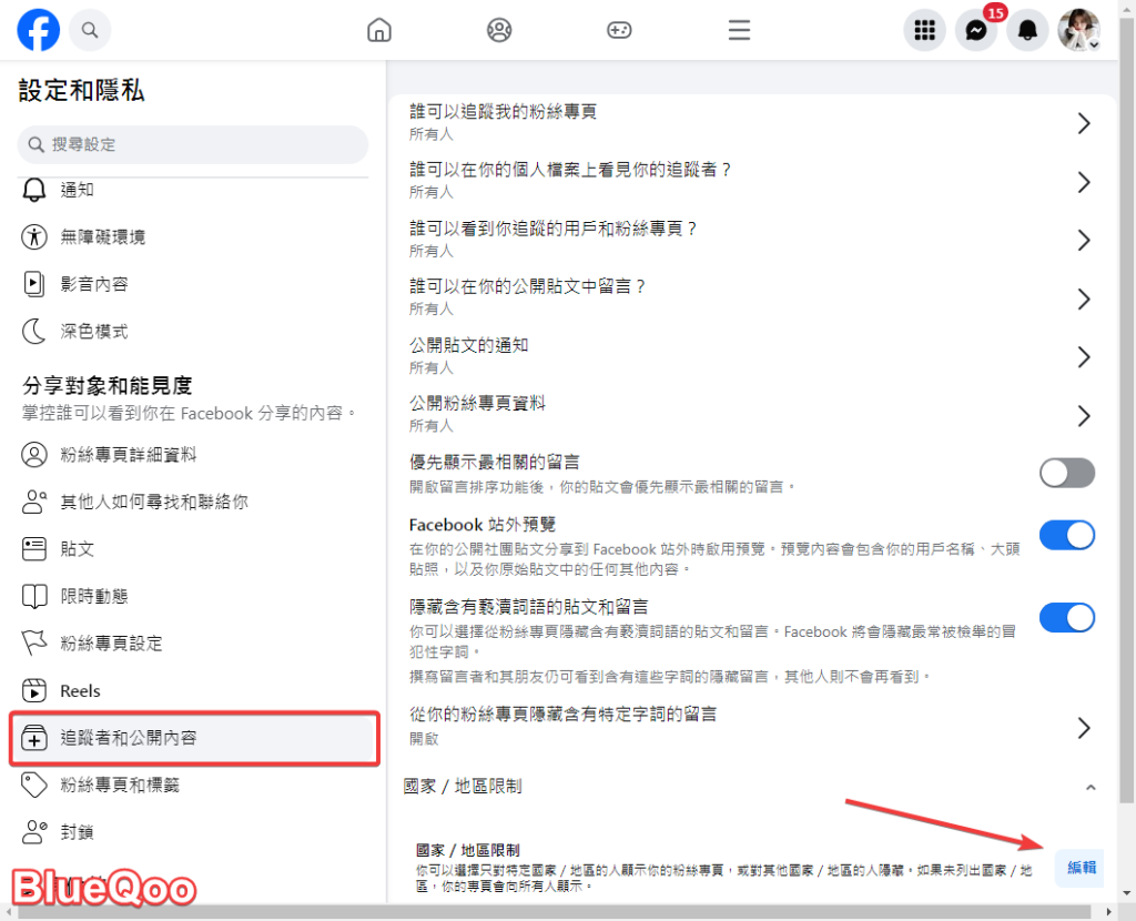 第三步:左邊往下拉,找到追蹤者和公開內容,然後右邊找到國家/地區限制,點擊”編輯”。