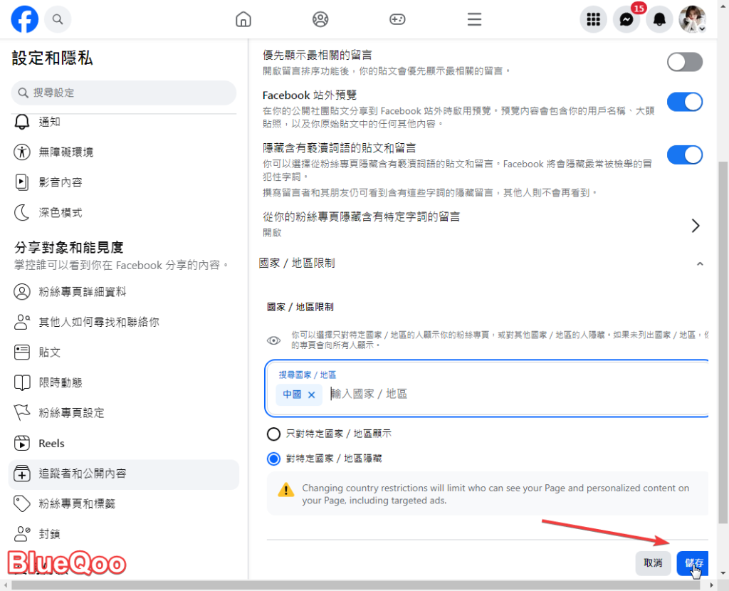 第四步:在搜尋國家/地區,打上想隱藏的國家或地區名稱,如下圖所示,預設是對特定國家/地區隱藏,最後按下”儲存”,就大功完成啦!!!