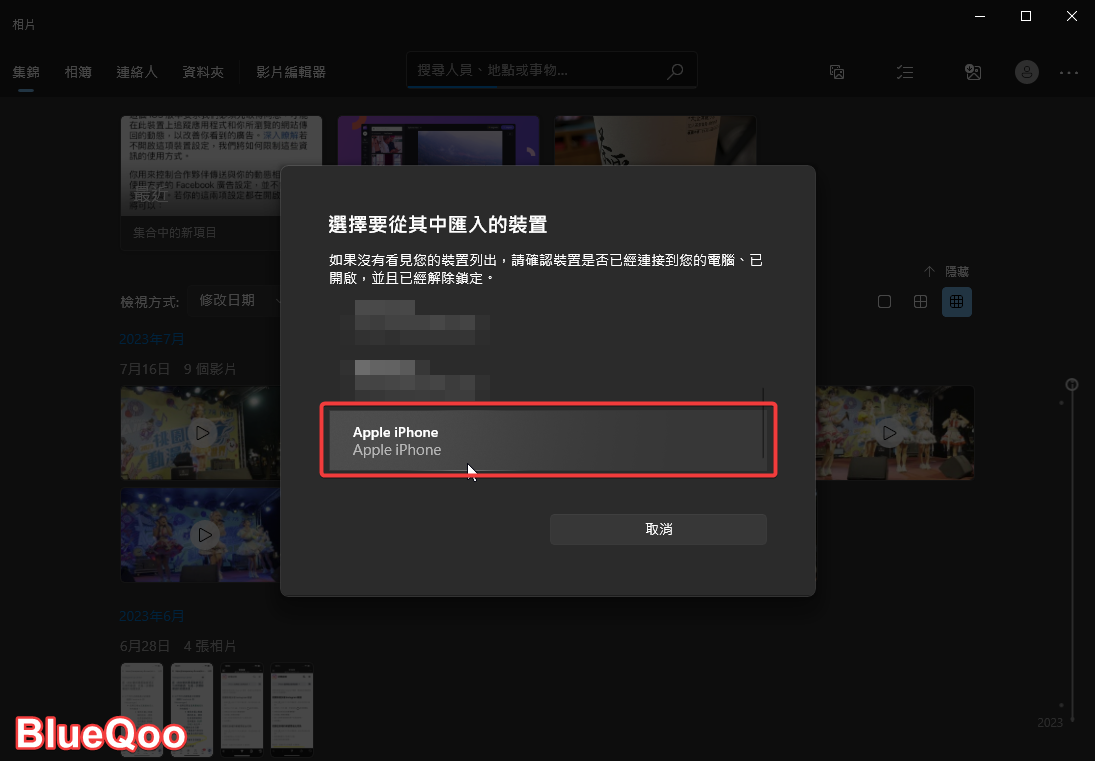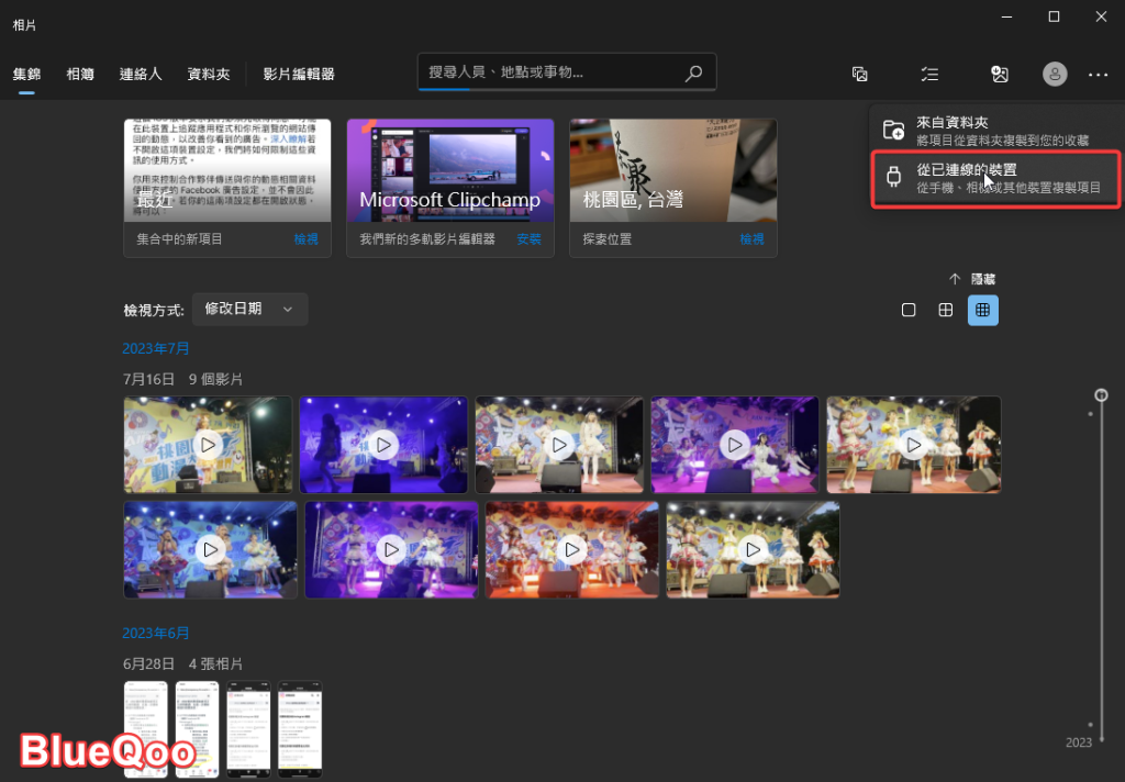 第一步 開啟Windows的相片,然後點選右上角,有個向下箭頭,選取”從已連線的裝置”