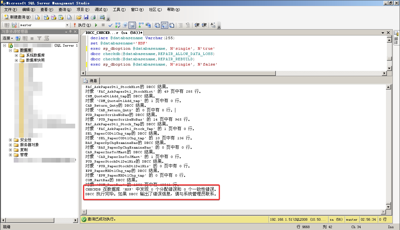 CHECKDB 在数据库 'HSF' 中发现 0 个分配错误和 0 个一致性错误。