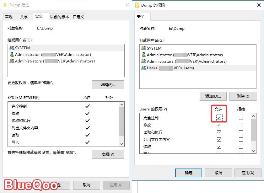第二步 添加完成之後,可以看到Dump的權限畫面多了一個Users,點它,然後將下方的完全控制打勾,如下圖所示: