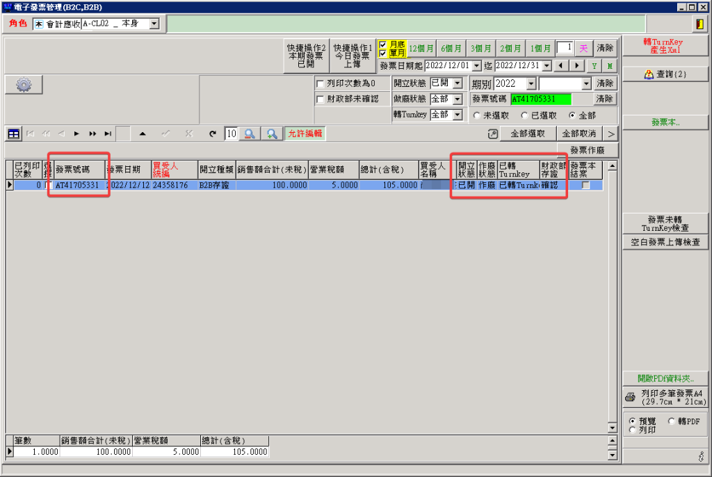 第一步:以下範例,這張電子發票已經作廢,且作廢狀態已轉Turnkey,財政部存證也確認之後。