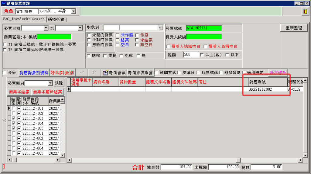 第二步:經由銷項發票查詢作業,可以查詢到這張發票對應的應收請款單。