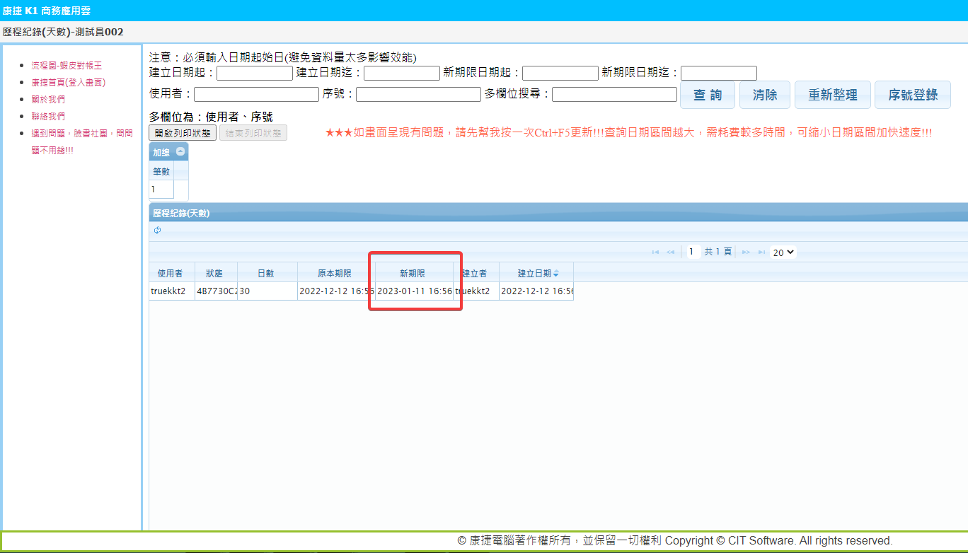 歷程記錄(天數),可查詢使用的期限到哪一天!
