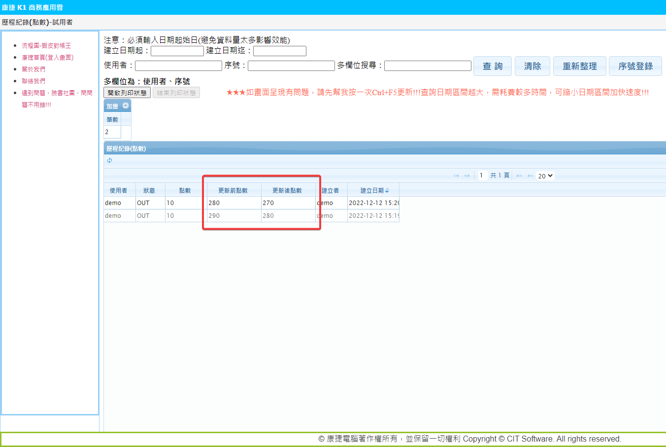 歷程記錄(點數),可查詢可使用的點數剩餘多少點!