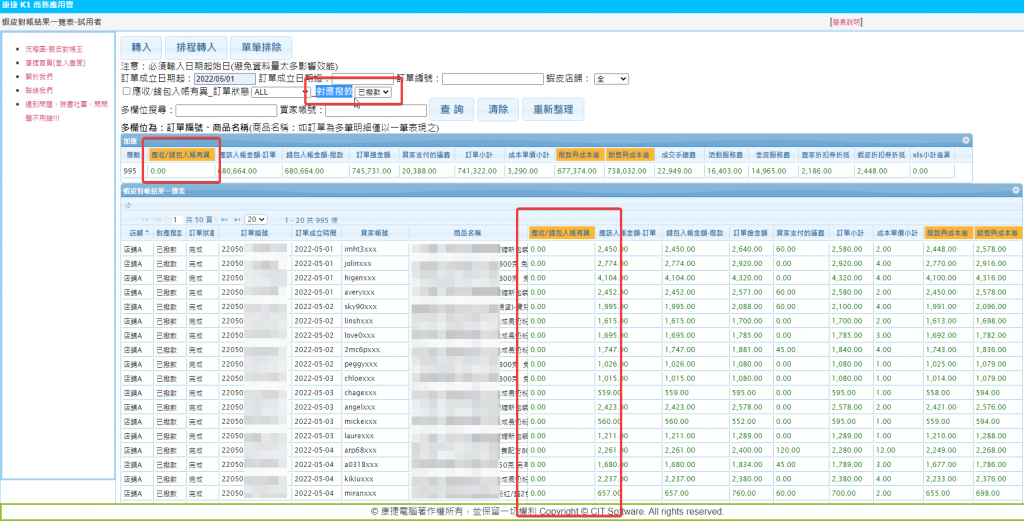 接著我們來到對帳一覽表來看看,首先查詢條件我們先輸入訂單成立日期起:2022/05/01。