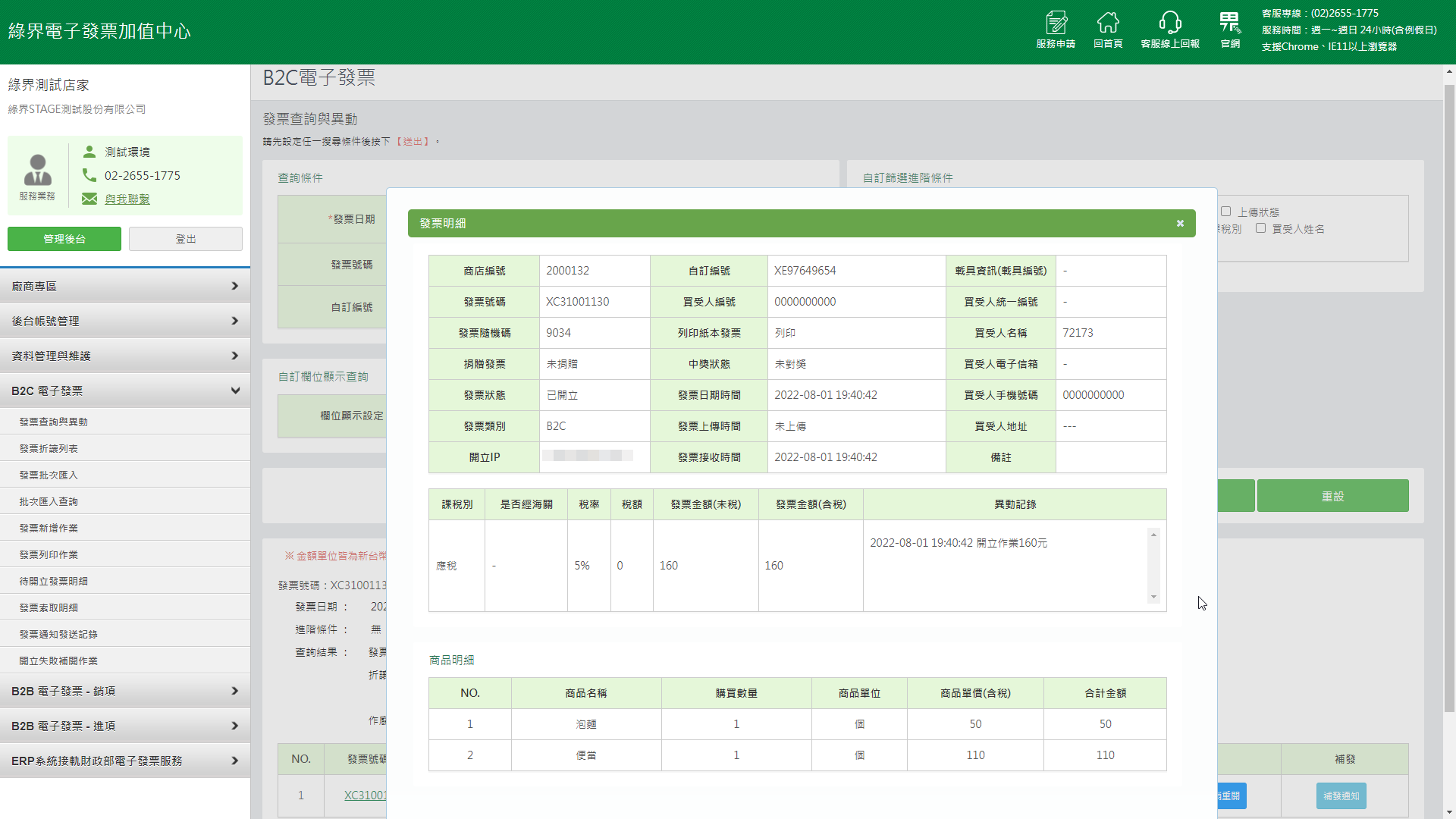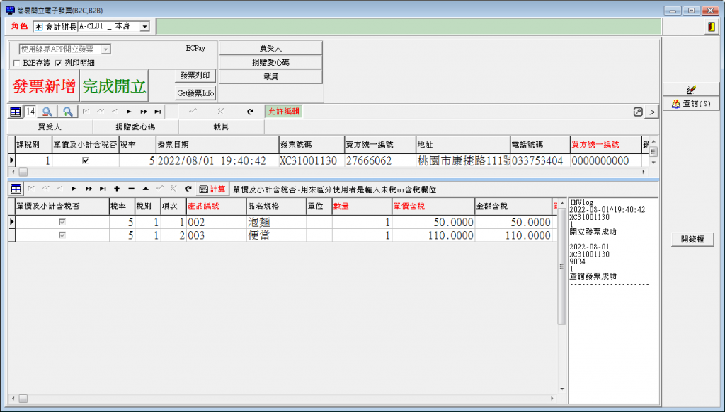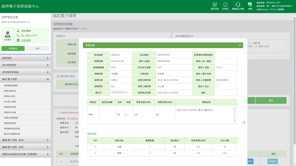 開立成功之後,可於綠界電子發票加值中心查詢到相同的發票號碼XC31001130