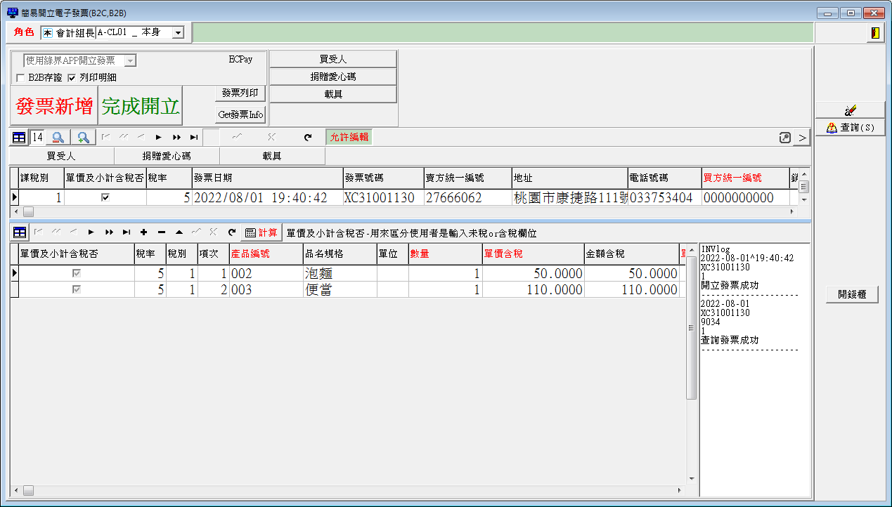 使用康捷POS系統開立發票XC31001130,系統會串接EcPay的API,開立電子發票。