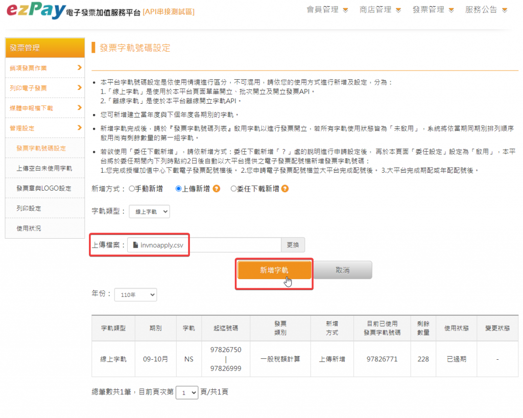 ezPay電子發票[API串接測試區]-發票字軌上傳 Posted on 2021-11-02Updated on 2023-12-14by 康捷QooCategories:電子發票 ezPay電子發票[API串接測試區]-發票字軌上傳