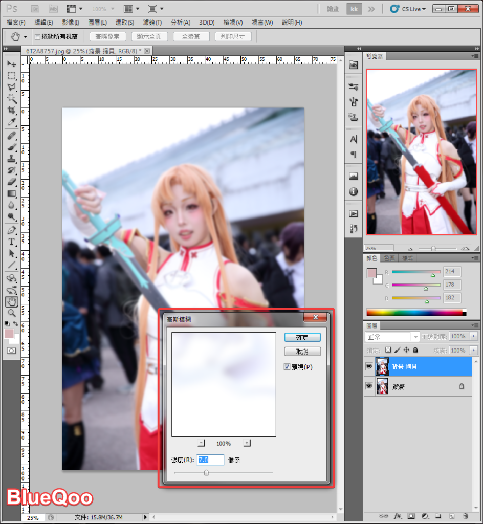 2.將複製的第二個圖層套用高斯模糊,強度選擇7px