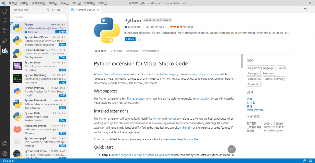 我們搜尋python,點選左上角有星號的這一個擴件。