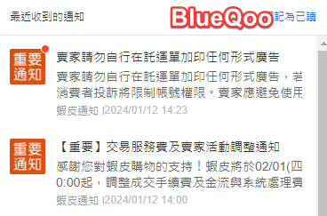 為打造更優質的電商平台,蝦皮將於2024/02/01(四)00:00起,調整成交手續費和金流與系統處理費之費率及計算方式,以及免運補貼和蝦幣回饋方案之內容,並配合調整蝦皮購物服務條款及蝦皮商城服務條款。請賣家務必留意相關資訊!