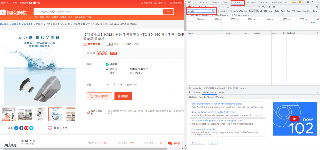 第三步 點選Network頁籤,會看到一個Filter的輸入框,點選輸入框,然後在格子內輸入shopid,接著用力按下鍵盤的F5