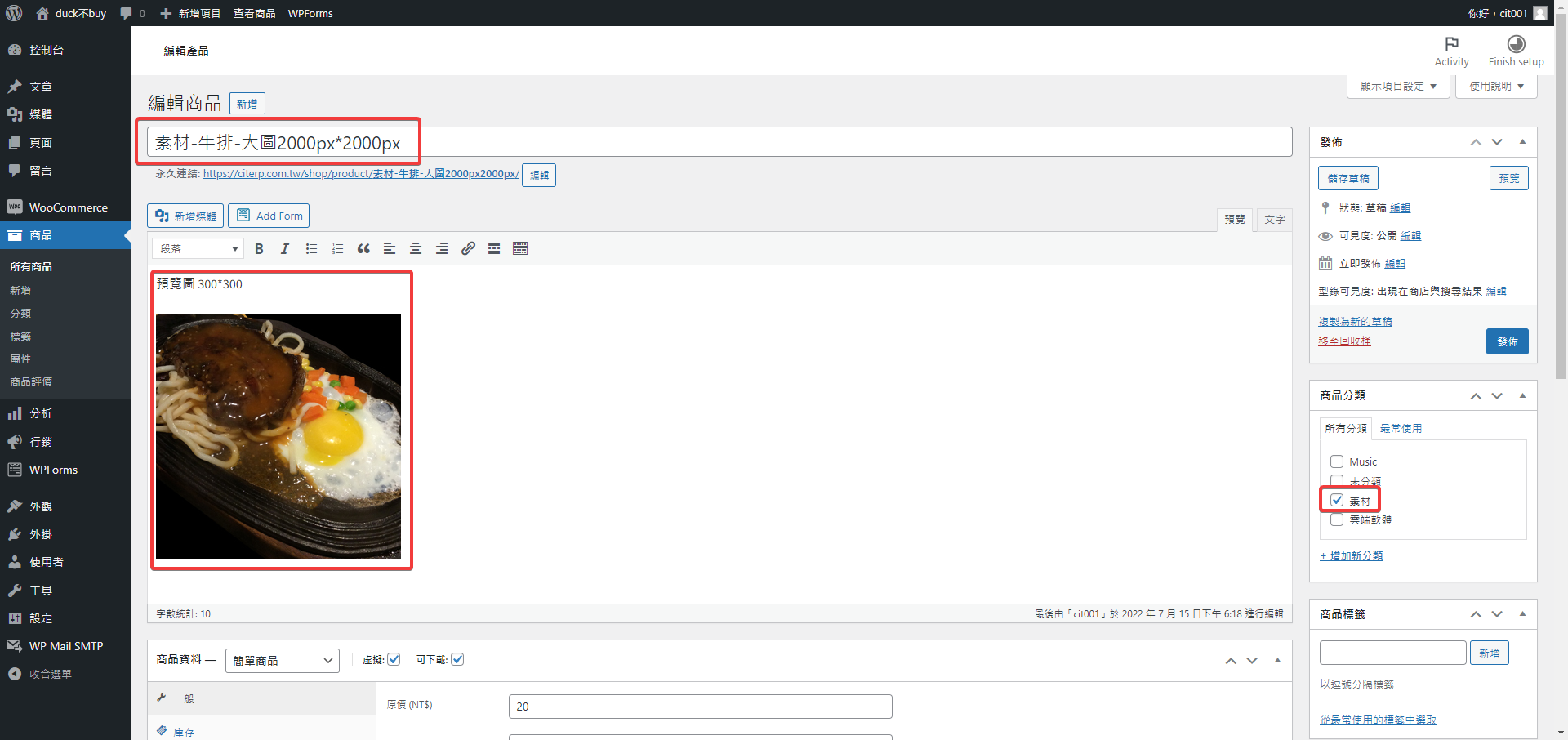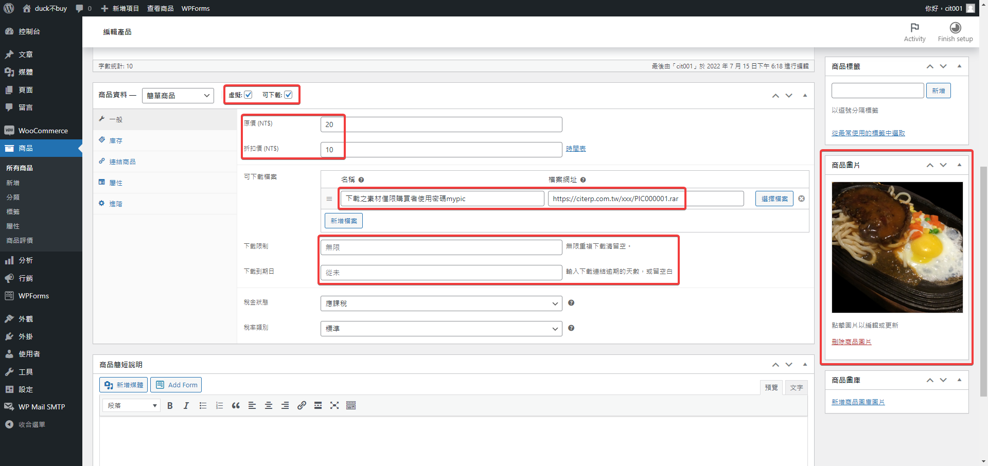第五步 勾選虛擬和可下載,輸入原價與折扣價,密碼可以放在名稱的地方,然後把剛剛可以下載的網址https://citerp.com.tw/xxx/PIC000001.rar放在檔案網址,這邊不用擔心網址會外洩,因為買家收到的下載網址是編碼過的。
