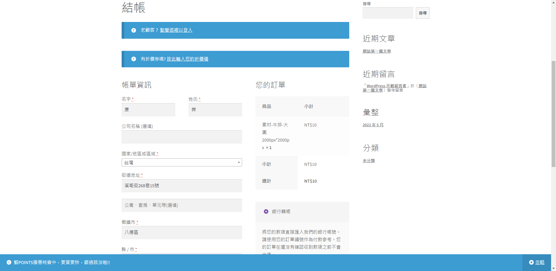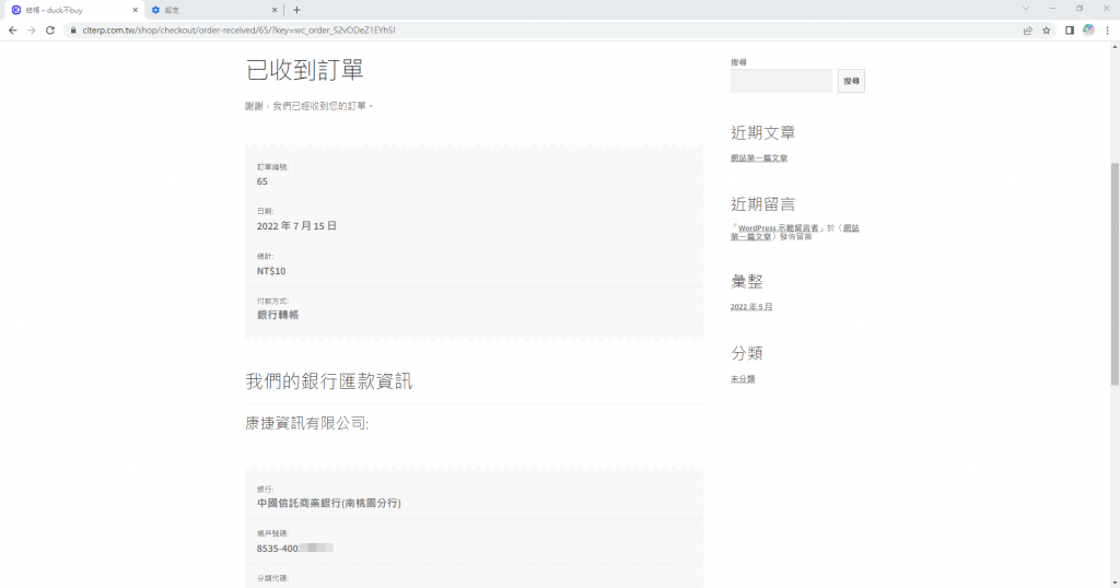 第七步 最後的畫面是訂單資訊,還有匯款資料,因為是使用銀行轉帳,WooCommerce當然還有其他收款方式,這邊就不多加說明了。