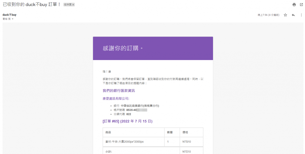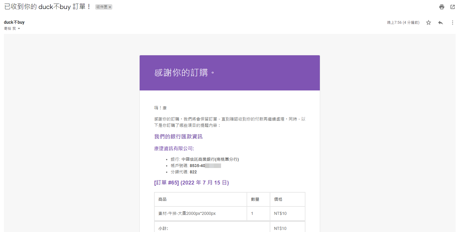 第八步 登入購買時填寫的電子信箱,可以發現購物網站也會同時發一封訂單的信件到信箱,因為是使用訪客的身分購買,所以基本上就是用電子信箱在做往來溝通。