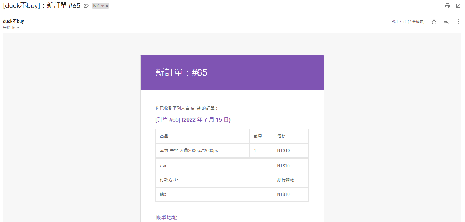 第九步 購物網站的管理員,也會同步收到新訂單的信件。