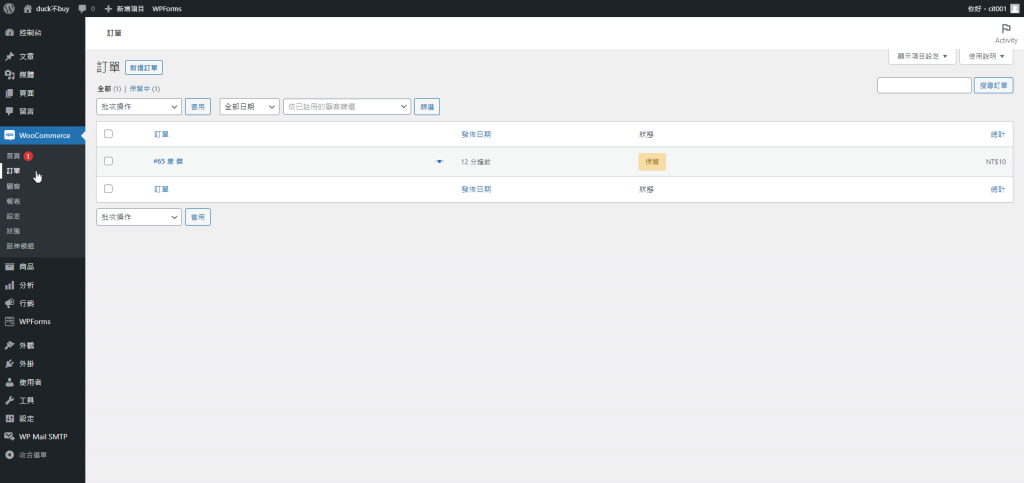 第十步 進入到WooCommerce後台管理,點選訂單。