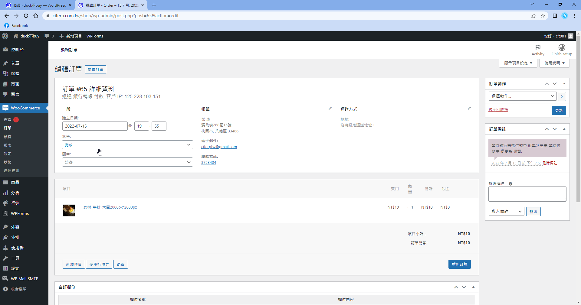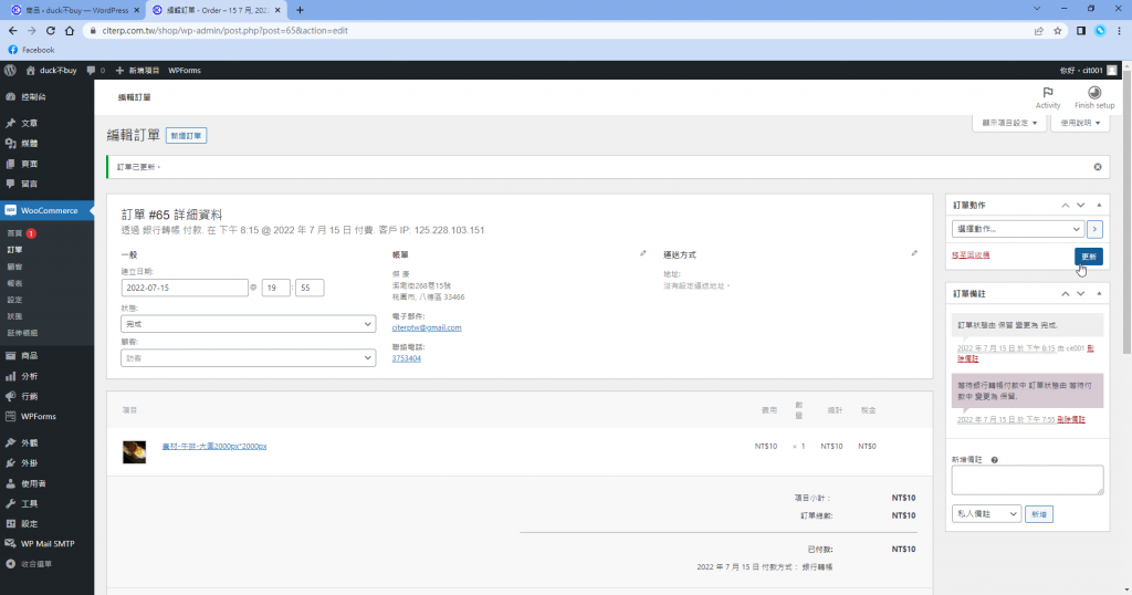 第十二步 確定買家已經匯款之後,修改訂單狀態,下拉選擇完成。