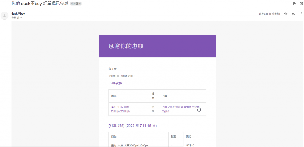 第十四步 訂單完成,買家就會收到”訂單現已完成”的信件,並且收到下載的連結。