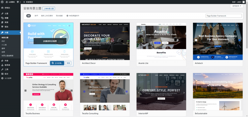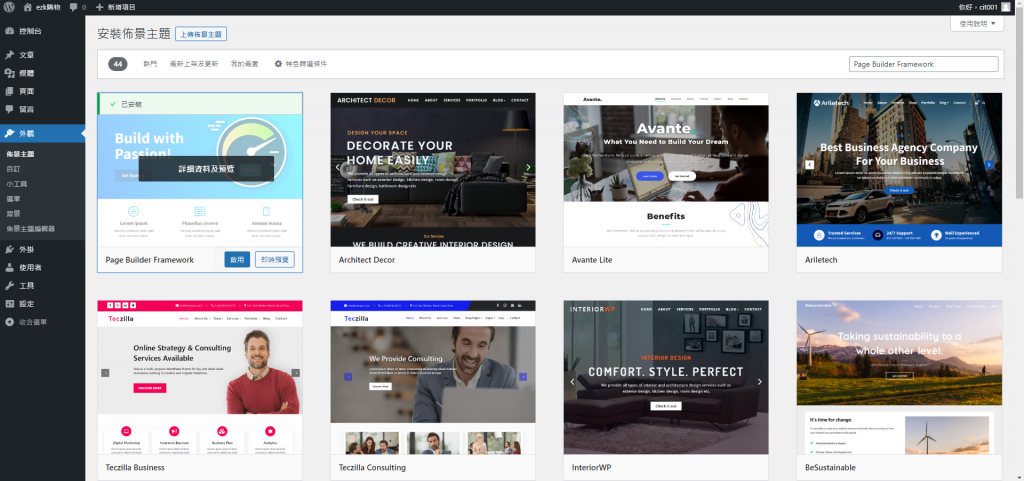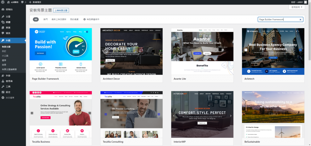 1.於控制台>安裝佈景主題,搜尋關鍵字Page Builder Framework。