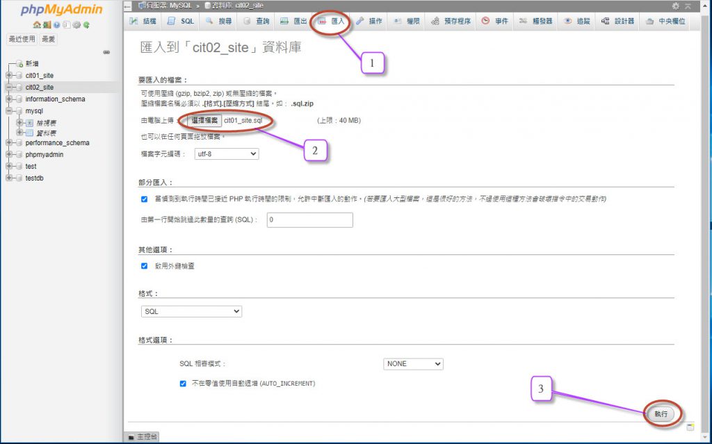 點擊要還原的「資料庫」 -> 點選匯入頁簽 -> 選擇要匯出入的檔案 -> 按執行。