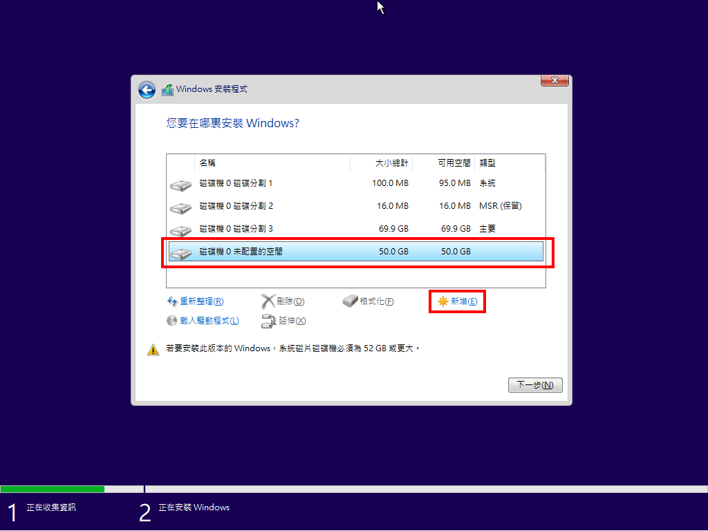 ▼已經建立磁碟分割1、2與3,如下圖所示。選擇「未配置的空間」,點選「新增」,繼續分割硬碟。