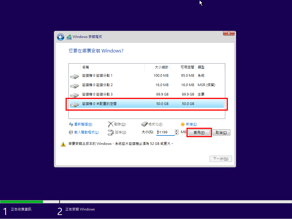 ▼點選「套用」,將剩下的硬碟空間設為一個分割區。