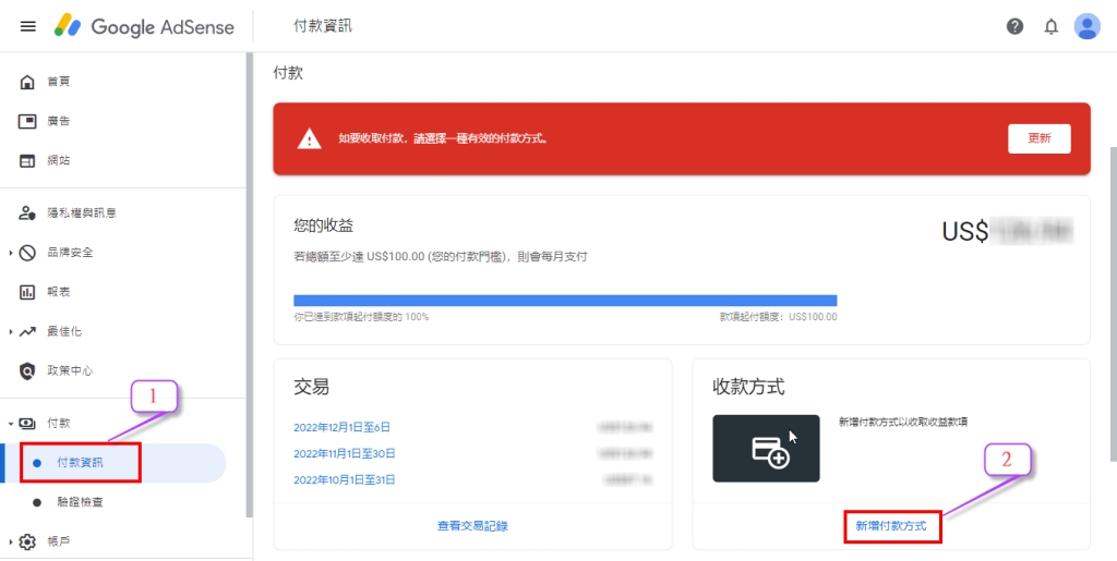 已經架站有一段時間了,終於在登入Google AdSense 帳戶時,看到「您的款項目前處於暫緩支付狀態。若要取消此狀態,您必須進行相關設定」這串文字,真是太好了。Google AdSense 是大部份架站的收入之一,當你把收益累積到 100 美金時,就達到「最低起付額度」的標準,也就是說 Google 已經同意開始付款給你了!接下來就為大家介紹如何填寫「付款方式」的相關資料。