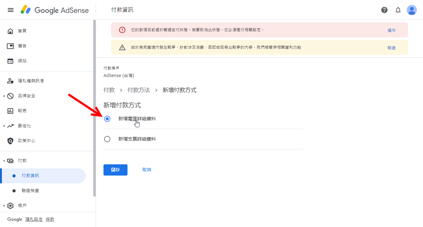▼點擊左側「付款」-> 「付款資訊」->新增付款方式