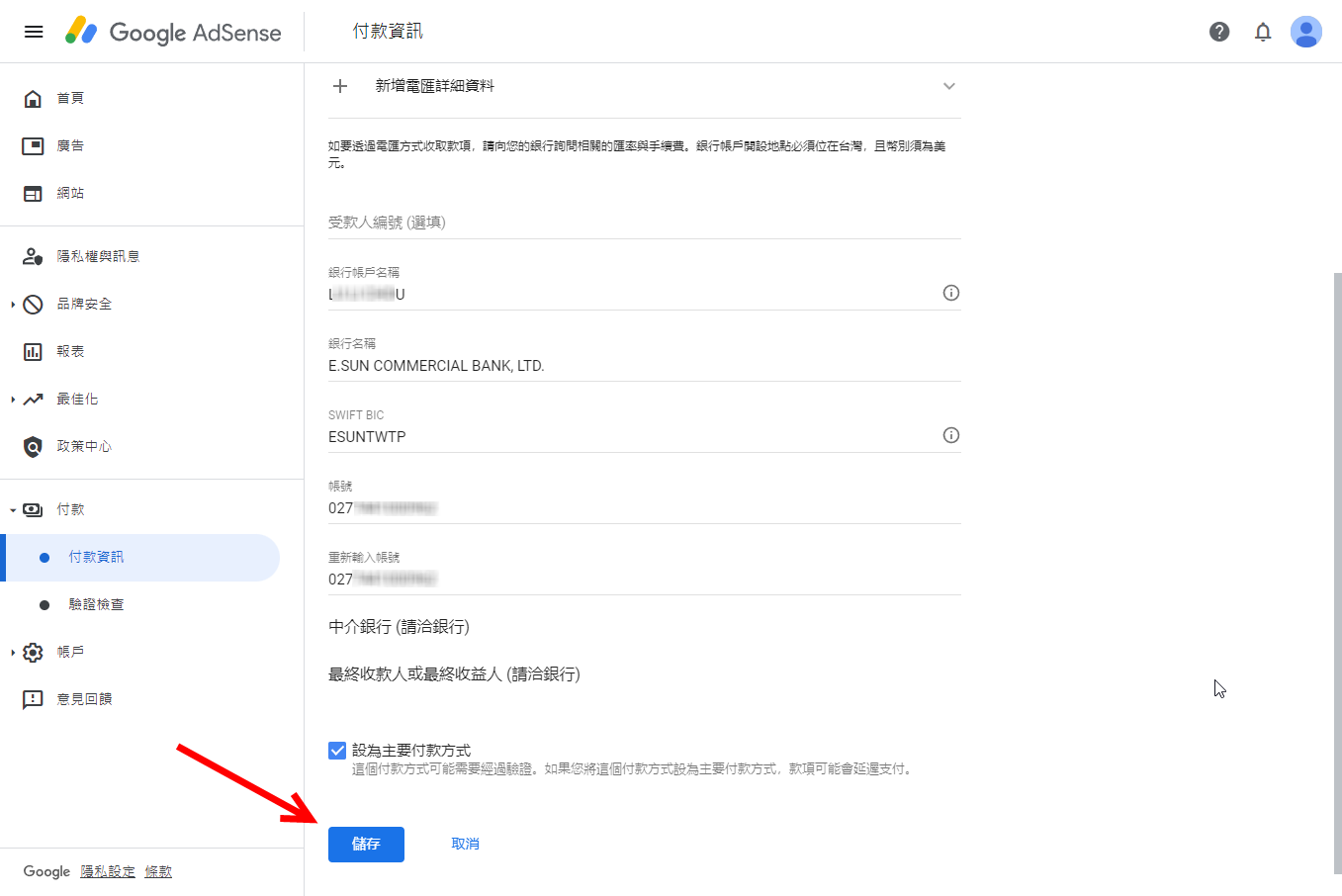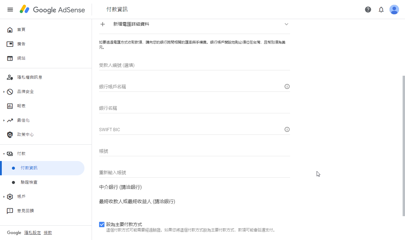 以目前台灣來說, AdSense 所提供的付款方式只有「電匯」與「支票」兩種。一般來說,選擇以「電匯」的方式較為方便與快速,只要相關的設定完成,在 Google 付款後的幾天內你就可以收到款項,但是需要扣除各家銀行的手續費。