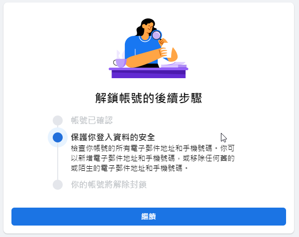 系統會提醒你檢查你帳號的所有電子郵件地址和手機號碼。你可以新增電子郵件地址和手機號碼,或移除任何舊的或陌生的電子郵件地址和手機號碼。