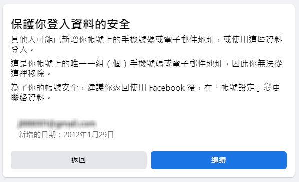 系統建議你返回使用 Facebook 後,在「帳號設定」變更聯絡資料。