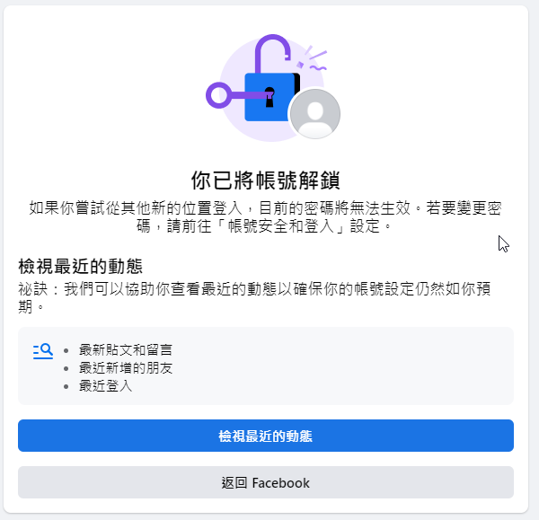 已將帳號解鎖了,如果你嘗試從其他新的位置登入,目前的密碼將無法生效。若要變更密碼,請前往「帳號安全和登入」設定。